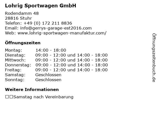 | Öffnungszeiten Lohrig Sportwagen GmbH in Stuhr anzeigen | |