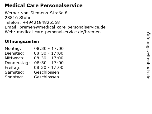 | Öffnungszeiten Medical Care Personalservice in Stuhr anzeigen | |