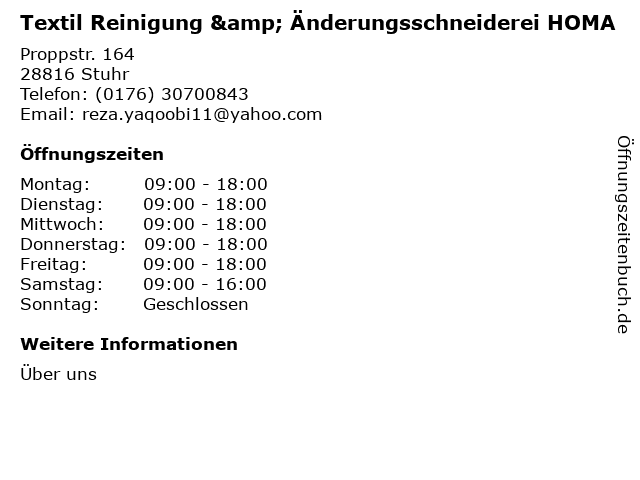 Branchen & Suchbegriffe zu Textil Reinigung & Änderungsschneiderei HOMA:homa, reinigung, textil, änderungsschneiderei |