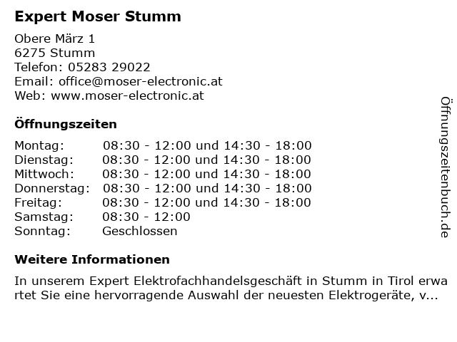 | Öffnungszeiten Expert Moser Stumm in Stumm anzeigen | |