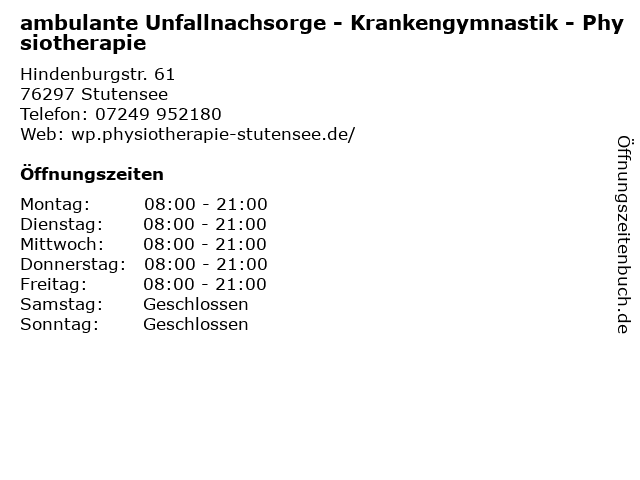 4 Praxis für Krankengymnastik Helga Hebestreit (Entfernung: 5,62 km) Karlsruher Straße 57, 76676 Graben-Neudorf 5 Krankengymnastik und Massagepraxis Waldemar Wesner (Entfernung: 6,56 km) Paul-Gerhardt-Str. 21, 76646 Bruchsal 6 |