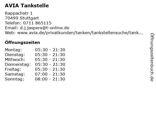 | Öffnungszeiten AVIA Tankstelle in Stuttgart anzeigen | |