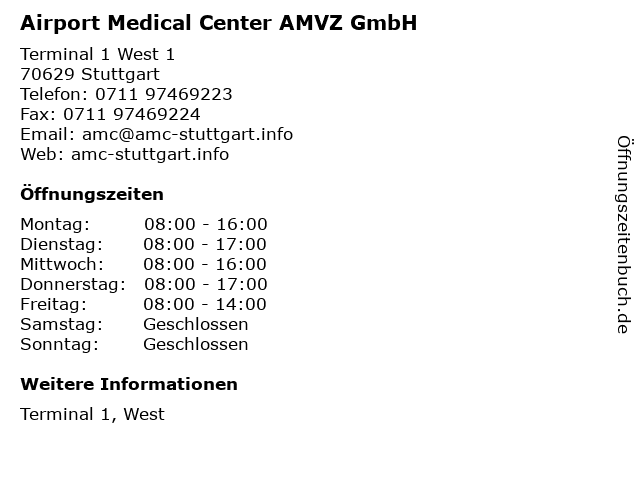 Branchen & Suchbegriffe zu Airport Medical Center AMVZ GmbH:airport, amvz, betriebsarzt, center, fliegerarzt, flughafen, medical, stuttgart airport |