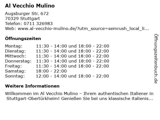 | Öffnungszeiten Al Vecchio Mulino in Stuttgart anzeigen | |