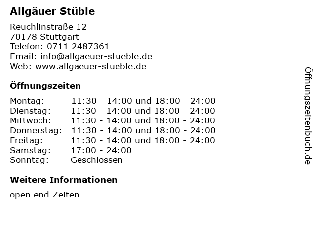 | Öffnungszeiten Allgäuer Stüble in Stuttgart anzeigen | |