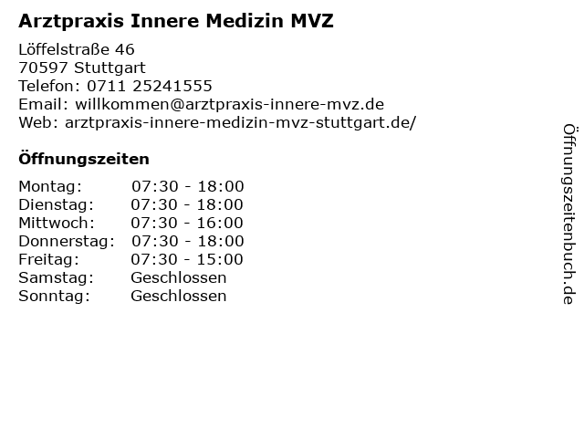 1 Cornelia Bäuerle Fachärztin für Innere Medizin (Entfernung: 0,71 km) Anna-Peters-Str. 4, 70597 Stuttgart 2 Michael Stadie - Facharzt für Innere Medizin (Entfernung: 0,77 km) Leinfeldener Str. 74, 70597 Stuttgart 3 Gudrun Gebert-Hirsch, Dr. med. SV LA - Fachärztin für Psychotherapeutische Medizin, Nervenärztin, Psychotherapie/- analyse (Entfernung: 0,94 km) Löwenstraße 79, 70597 Stuttgart 4 Dres. med. Schweizer - Privatärztliche Praxis für Integrative Medizin und Prävention (Entfernung: 1,74 km) Böblinger Straße 87, 70199 Stuttgart 5 Dr. Rainer Hakimi Facharzt für Allgemein Medizin und Psychotherapie (Entfernung: 2,10 km) Schickhardtstr. 33, 70199 Stuttgart 6 |