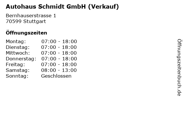 | Öffnungszeiten Autohaus Schmidt GmbH (Verkauf) in Stuttgart anzeigen | |
