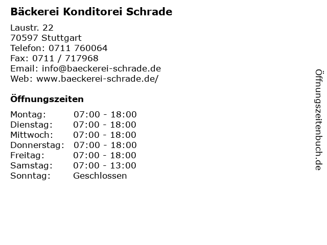 | Öffnungszeiten Bäckerei Konditorei Schrade in Stuttgart anzeigen | |