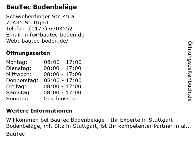 | Öffnungszeiten BauTec Bodenbeläge in Stuttgart anzeigen | |