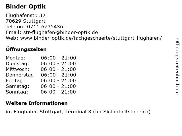 | Öffnungszeiten Binder Optik in Stuttgart anzeigen | |