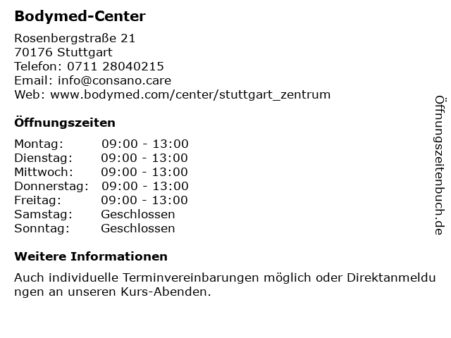| Öffnungszeiten Bodymed-Center in Stuttgart anzeigen | |