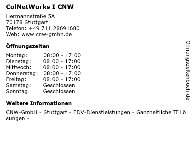 | Öffnungszeiten ColNetWorks I CNW in Stuttgart anzeigen | |