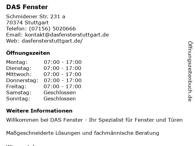 | Öffnungszeiten DAS Fenster in Stuttgart anzeigen | |