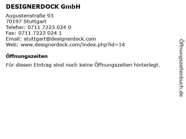 | Öffnungszeiten DESIGNERDOCK GmbH in Stuttgart anzeigen | |