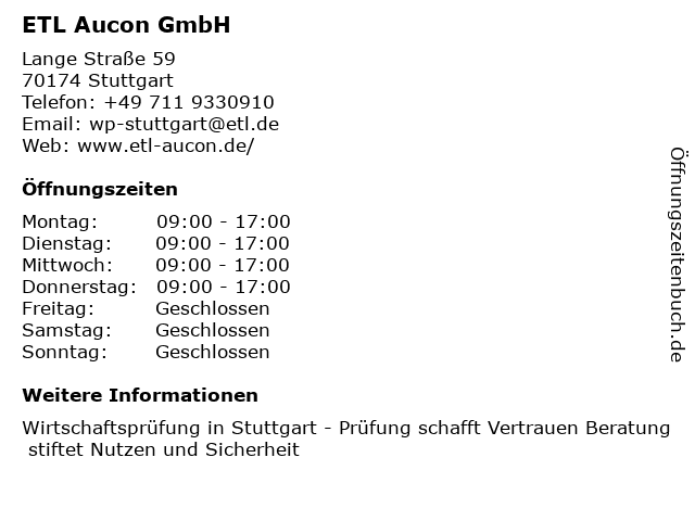 | Öffnungszeiten ETL Aucon GmbH in Stuttgart anzeigen | |