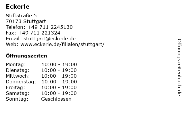 | Öffnungszeiten Eckerle in Stuttgart anzeigen | |