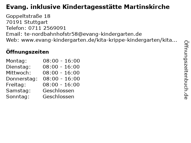 1 Evang. inklusive Kindertagesstätte Martinskirche (Entfernung: 0,60 km) Nordbahnhofstr. 58, 70191 Stuttgart 3 Ev. Kirchengemeinde Stuttgart Nord Pfarramt Martinskirche (Entfernung: 0,60 km) Nordbahnhofstr. 58, 70191 Stuttgart 4 Schulstiftung der Evang. Landeskirche in Württemberg Weckherlin-Haus Bildungsträger (Entfernung: 0,69 km) Heilbronner Str. 180, 70191 Stuttgart 6 |