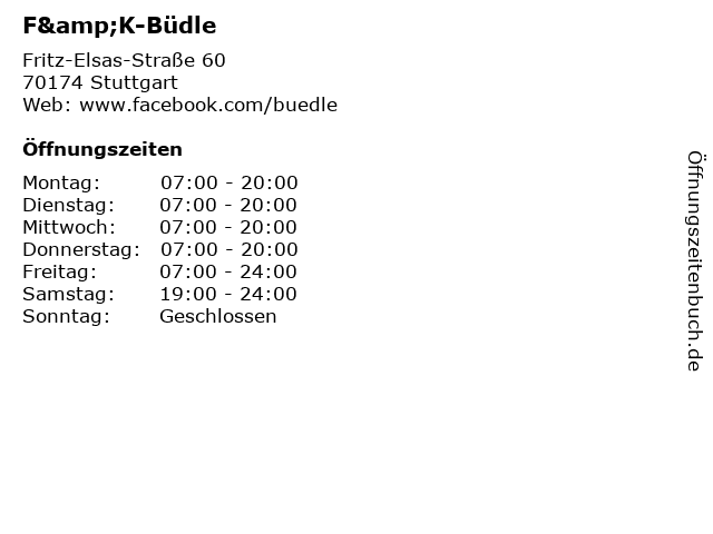 | Öffnungszeiten F&K-Büdle in Stuttgart anzeigen | |