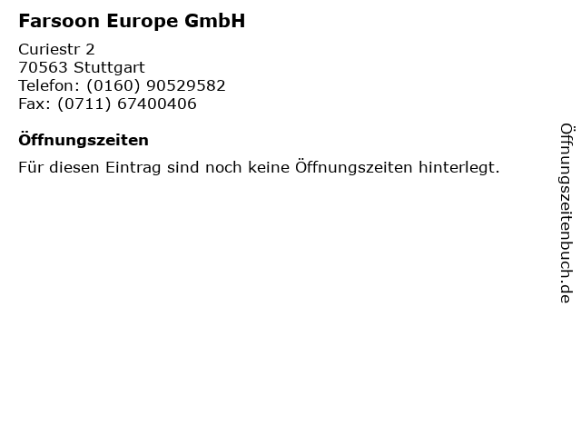 | Öffnungszeiten Farsoon Europe GmbH in Stuttgart anzeigen | |