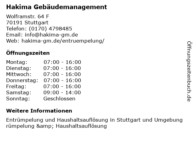 | Öffnungszeiten Hakima Gebäudemanagement in Stuttgart anzeigen | |