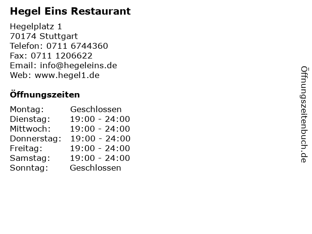 | Öffnungszeiten Hegel Eins Restaurant in Stuttgart anzeigen | |