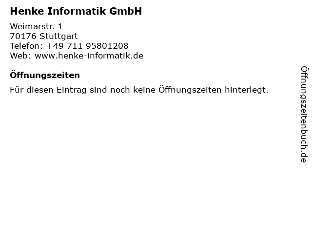| Öffnungszeiten Henke Informatik GmbH in Stuttgart anzeigen | |
