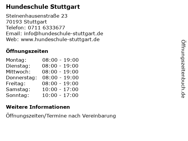 | Öffnungszeiten Hundeschule Stuttgart in Stuttgart anzeigen | |