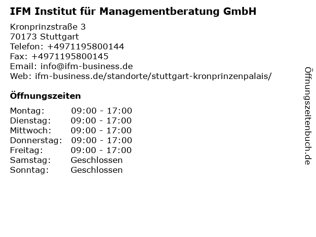 1 IFM Institut für Managementberatung GmbH (Entfernung: 7,34 km) Schulze-Delitzsch-Str. 28, 70565 Stuttgart 2 Mühlenhoff + Partner Managementberatung GmbH, NL Stuttgart (Entfernung: 0,31 km) Königstr. 58, 70173 Stuttgart 3 Kosmetik Dermalance - Institut für Schönheit und Gesundheit (Entfernung: 0,38 km) Nadlerstraße 10, 70173 Stuttgart 4 Deutsch-Amerikanisches Zentrum - James-F.-Byrnes-Institut e.V. (Entfernung: 0,41 km) Charlottenplatz 17, 70173 Stuttgart 6 |