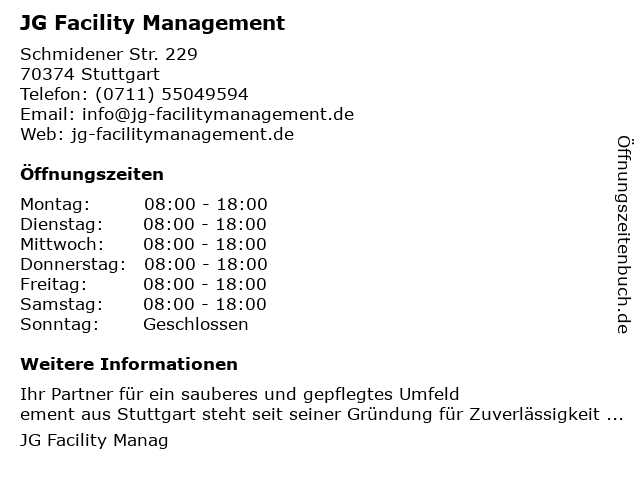 | Öffnungszeiten JG Facility Management in Stuttgart anzeigen | |