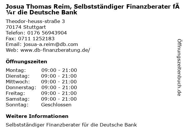 Branchen & Suchbegriffe zu Josua Thomas Reim, Selbstständiger Finanzberater für die Deutsche Bank:bank, deutsche, finanzberater, josua, reim, selbstständiger, thomas |