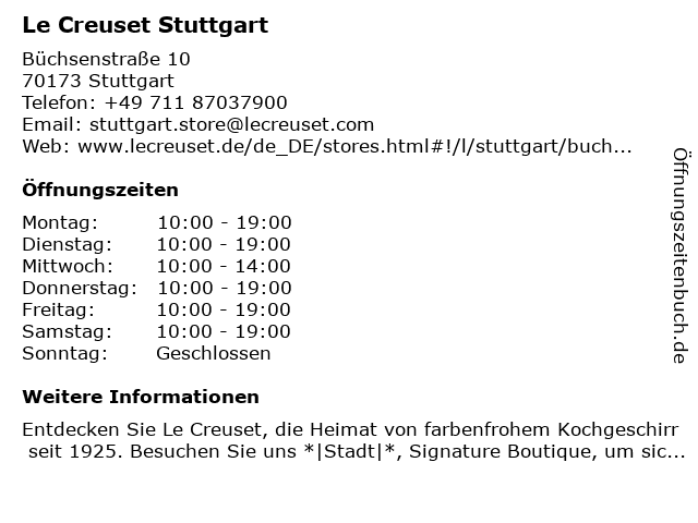 | Öffnungszeiten Le Creuset Stuttgart in Stuttgart anzeigen | |