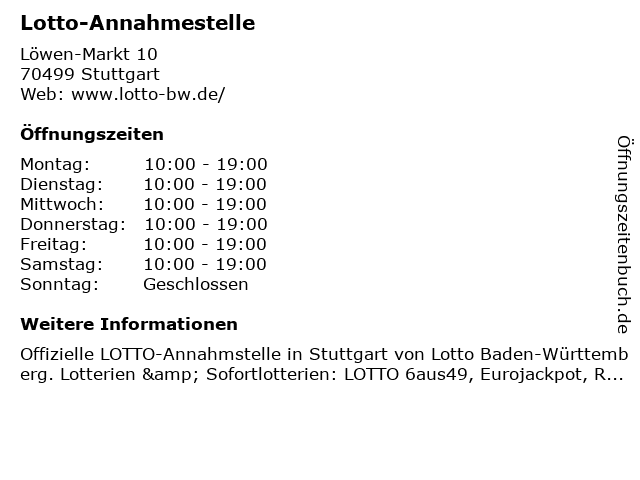 | Öffnungszeiten Lotto-Annahmestelle in Stuttgart anzeigen | |