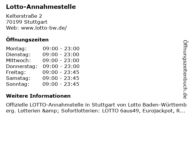 | Öffnungszeiten Lotto-Annahmestelle in Stuttgart anzeigen | |