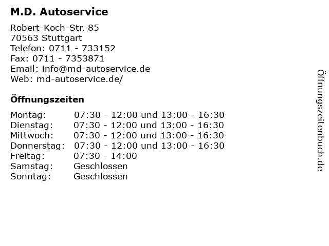 | Öffnungszeiten M.D. Autoservice in Stuttgart anzeigen | |