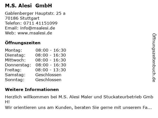 | Öffnungszeiten M.S. Alesi GmbH in Stuttgart anzeigen | |