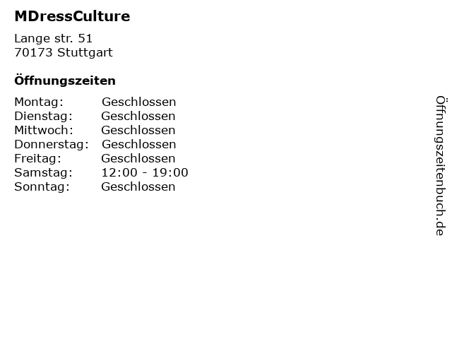 | Öffnungszeiten MDressCulture in Stuttgart anzeigen | |