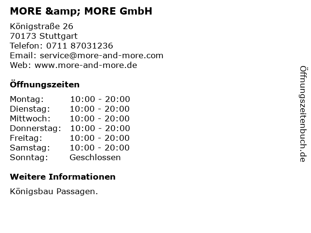 | Öffnungszeiten MORE & MORE GmbH in Stuttgart anzeigen | |