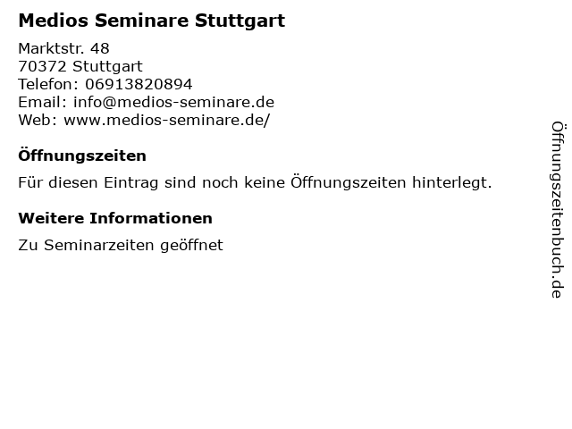 | Öffnungszeiten Medios Seminare Stuttgart in Stuttgart anzeigen | |