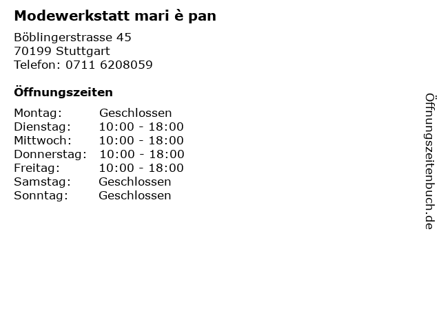 | Adresse Modewerkstatt mari è pan in Stuttgart anzeigen |