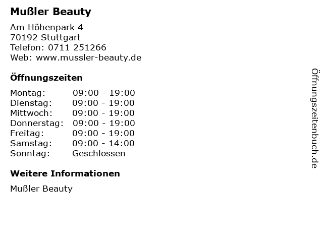 | Öffnungszeiten Mußler Beauty in Stuttgart anzeigen | |