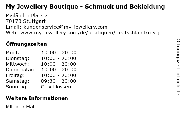 | Öffnungszeiten My Jewellery Boutique - Schmuck und Bekleidung in Stuttgart anzeigen | |