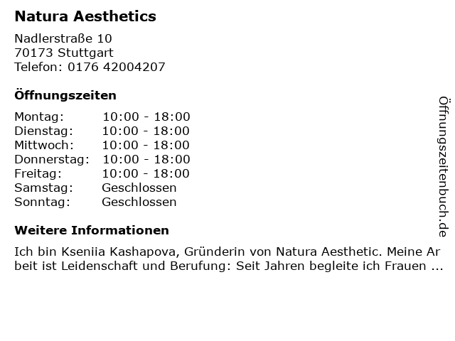 | Öffnungszeiten Natura Aesthetics in Stuttgart anzeigen | |