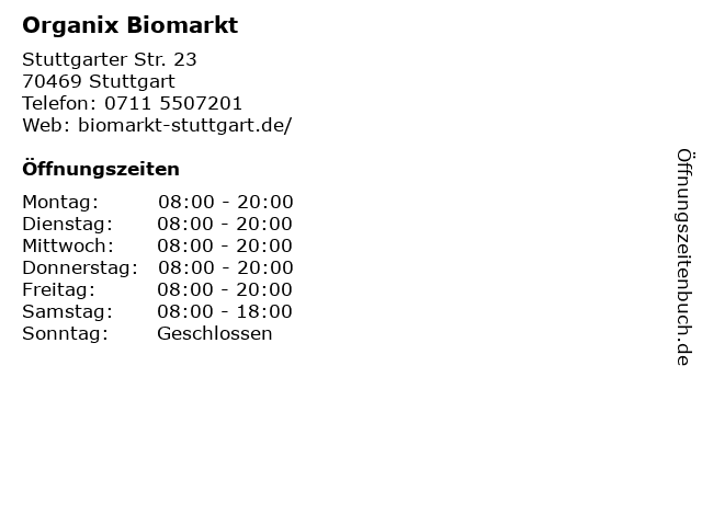 | Öffnungszeiten Organix Biomarkt in Stuttgart anzeigen | |