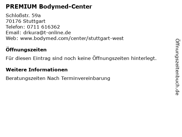 | Öffnungszeiten PREMIUM Bodymed-Center in Stuttgart anzeigen | |