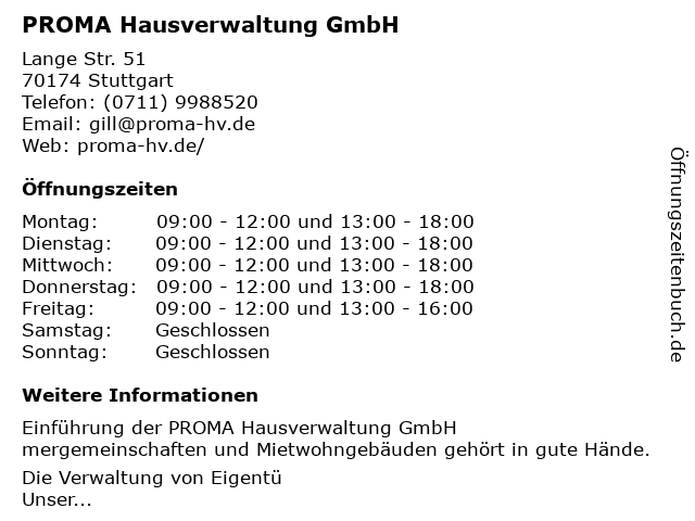 | Öffnungszeiten PROMA Hausverwaltung GmbH in Stuttgart anzeigen | |