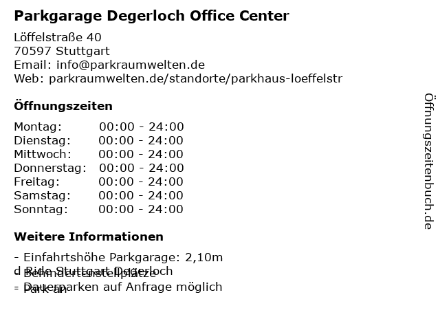 | Öffnungszeiten Parkgarage Degerloch Office Center in Stuttgart anzeigen | |