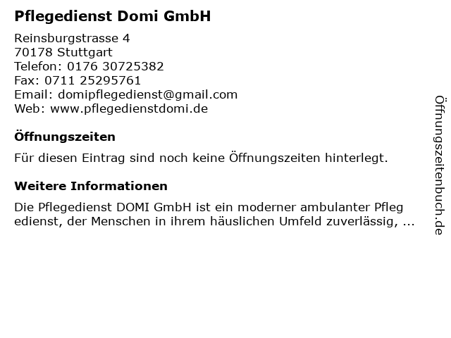 | Öffnungszeiten Pflegedienst Domi GmbH in Stuttgart anzeigen | |