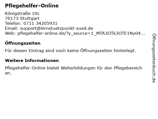 | Öffnungszeiten Pflegehelfer-Online in Stuttgart anzeigen | |