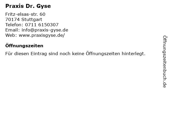 | Öffnungszeiten Praxis Dr. Gyse in Stuttgart anzeigen | |