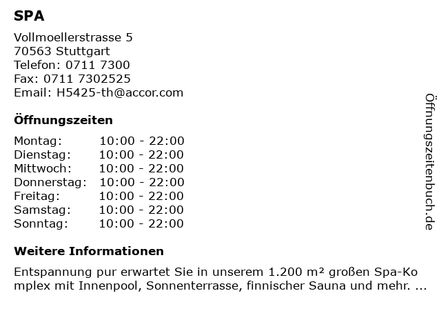 | Öffnungszeiten SPA in Stuttgart anzeigen | |